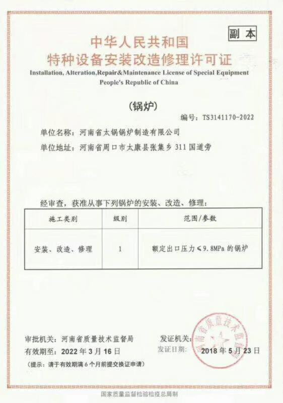 A級(jí)鍋爐制造許可證